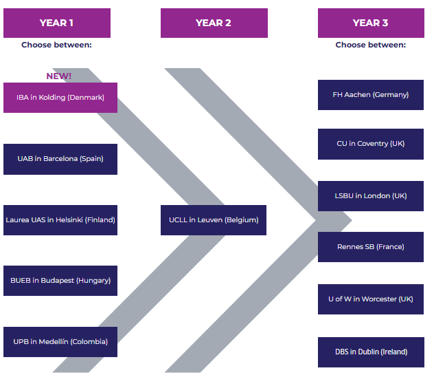 Several well-known European business schools have joined forces to put together this innovative and international study track. The diploma you will obtain is equivalent to the Dutch language bachelor degree in Business Management, option Marketing. The big difference is that you study in English in three different countries: